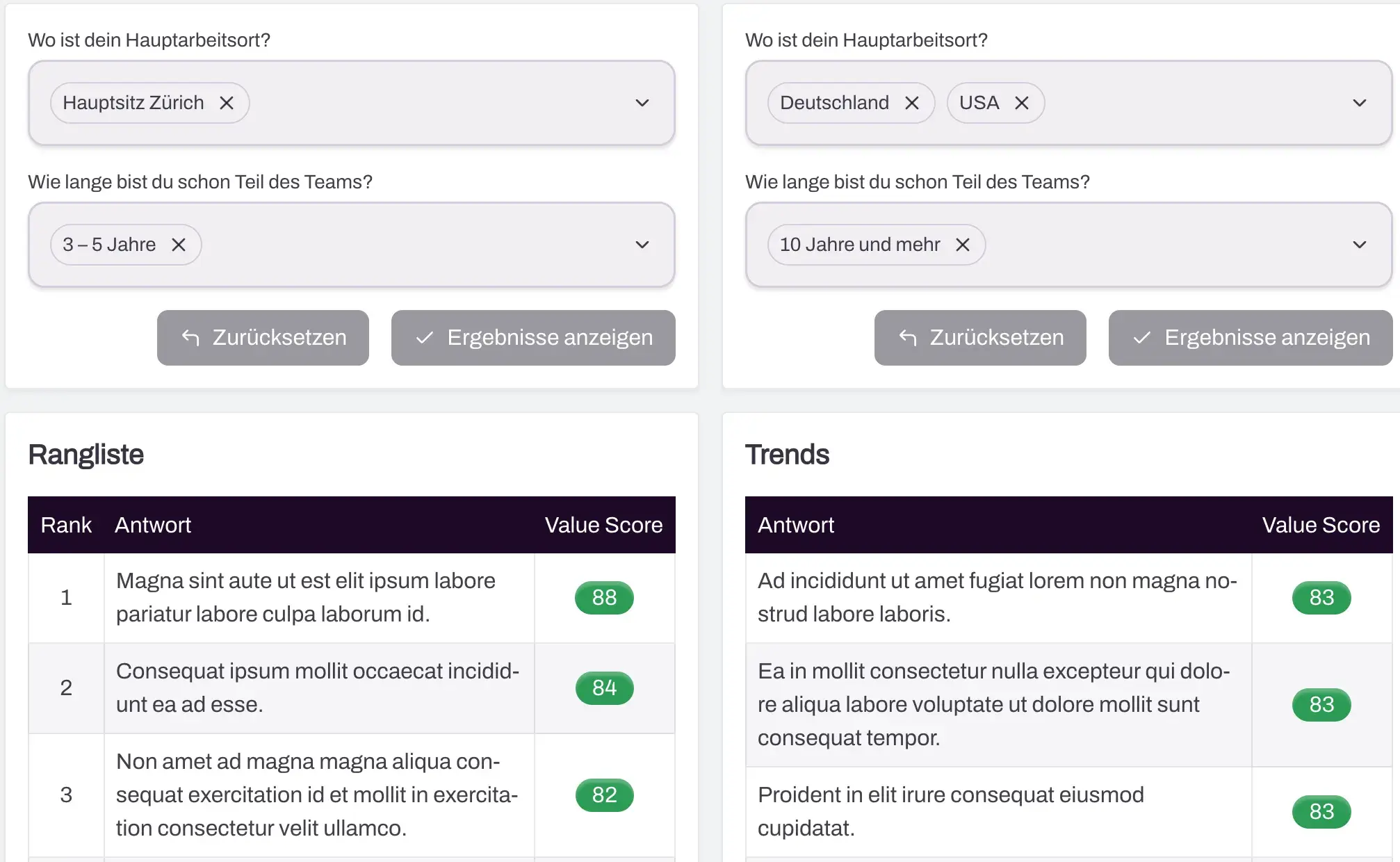 Sehen Sie auf einen Blick Unterschiede zwischen Standorten, Abteilungen oder anderen Kriterien. Ein Klick, volle Transparenz.