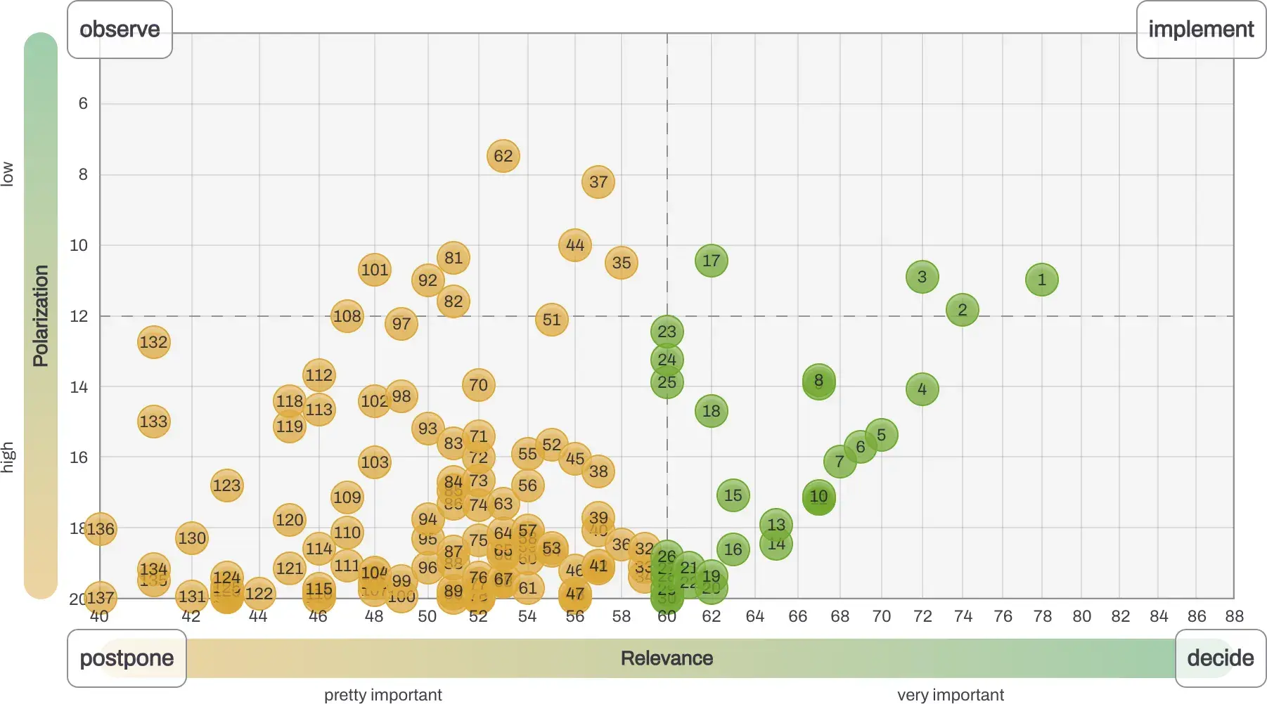 You receive all topics ranked by priority – with your stakeholders' arguments directly beneath. Ready to present to your decision-making bodies.