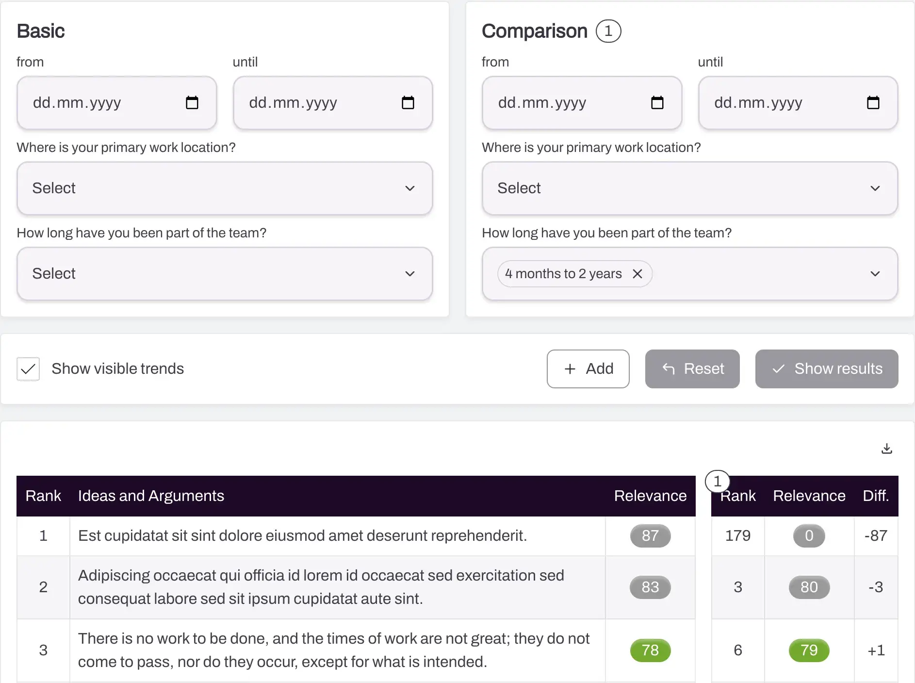 Compare departments, regions, or custom criteria – in one click. You immediately see where consensus holds and where factions diverge.